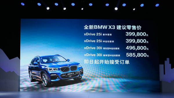 上市初期将提供BMW X3 xDrive 25i和BMW X3 xDrive 30i两种车型,每种车型提供豪华套装和M运动套装两种选择。这些车型不仅是脱胎换骨的新车,还是高配置和高价值的典范。“迎宾光毯”、10.25英寸智能触控中央显示屏、自然语音识别系统、感应式电动尾门等高级配置数不胜数,还有专为中国客户设计的舒适后排座椅,以及同级最大全景天窗、智能自适应LED大灯、PM 2.5空气滤清器等20余项高价值装备全系标配。创新感、豪华感和价值感让新车极具吸引力和竞争力。面向中国社会那些独立、自信且富有责任感的成就者,全新BMW X3将成为新的豪华理念和现代生活方式的理想之选。