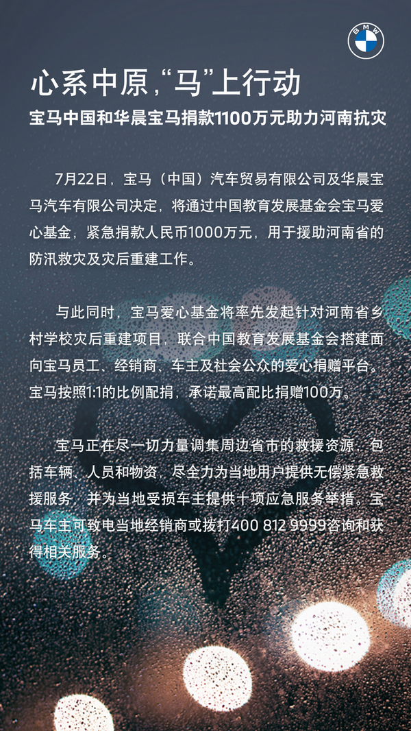 宝马中国及华晨宝马将持续关注防汛救灾工作,助力政府及社会各界救援力量及爱心人士,众志成城,河南加油!