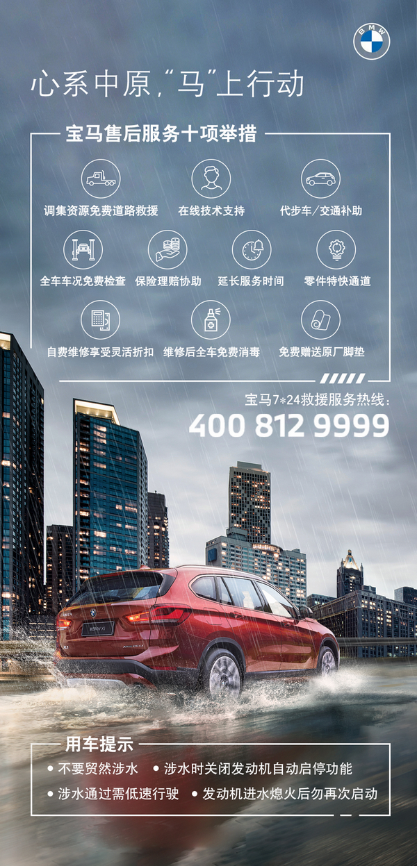 此刻,宝马正在尽一切力量调集周边省市的救援资源,包括车辆、人员和物资,尽全力为当地用户提供无偿紧急救援服务,并为当地受损车主提供十项应急服务举措。宝马车主可致电当地经销商或拨打7x24小时救援服务热线400 812 9999咨询和获得相关服务。