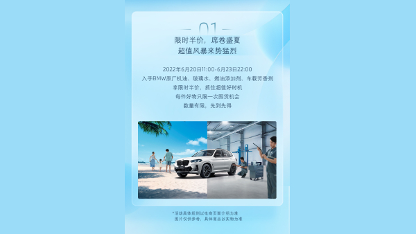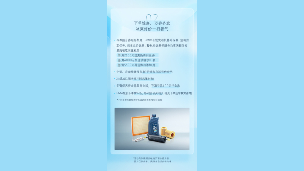 夏季车主关怀服务期间,BMW原厂机油已加入限时半价活动,BMW发动机基础保养套餐也享受“夏日清凉券”满减活动。